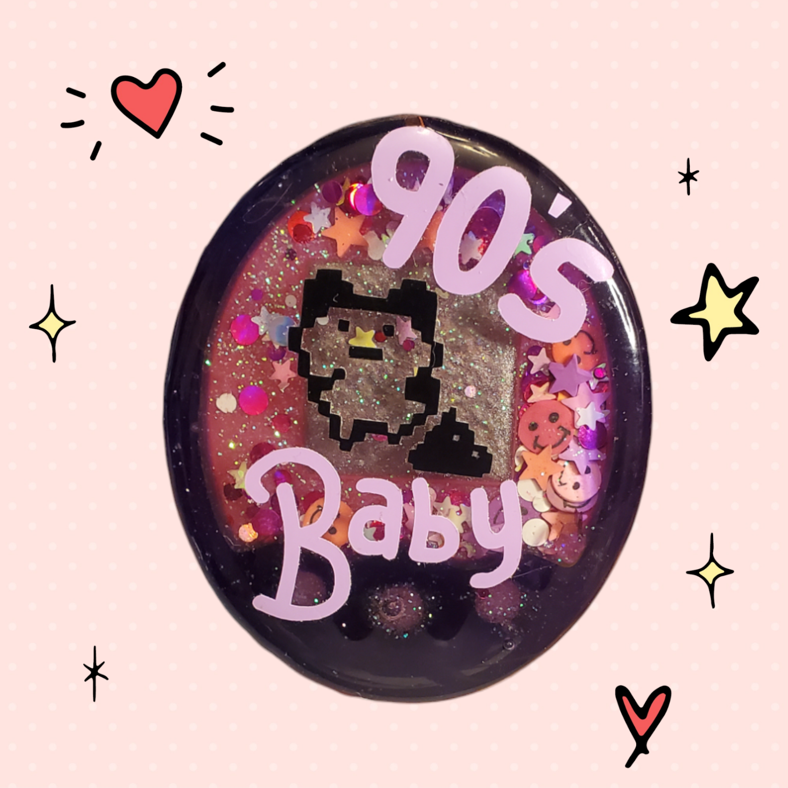 Are you a child of the 90s or 2000s feeling a bit nostalgic? Our Digital Pet-inspired shaker keychain is the perfect way to relive those memories! It comes in a variety of fun colors and is packed with joy! Please keep in mind that vinyl work is currently unavailable, so there won’t be any text or pet pictures on it.